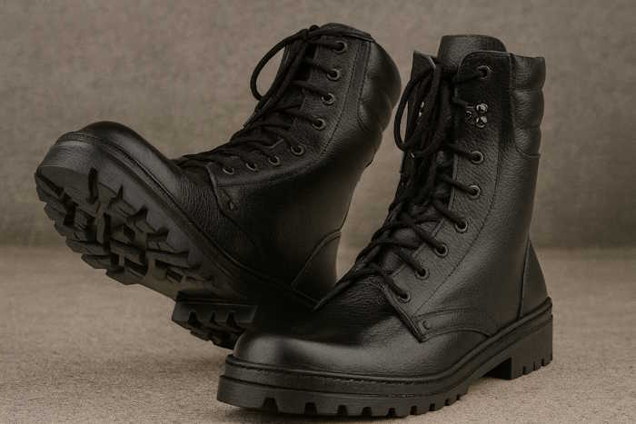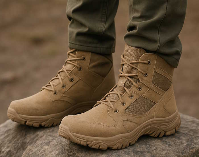 Тактическая обувь чаще комбинированная: кожа или нубук в нагруженных зонах и плотная ткань (по типу кордуры) там, где важна вентиляция и снижение веса. Она лучше «дышит», быстрее сохнет и комфортнее ощущается при постоянной работе в поле.